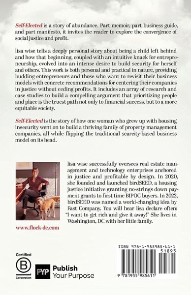 A just company creates a win-win in business. Many businesses focus on the numbers. The bottomline seems to be the primary indicator of success. However, lisa wise has not just learned but implemented first-hand the truth that businesses and business leaders who redefine business success-adjusting their focus away from profit and onto their people and those in their communities-see business soar. Self-Elected is lisa's personal testament to the power of abundance and the profitable outcomes that occur when business leaders embrace social entrepreneurship, investing in their people, in their communities and in causes that matter to them and their customers. Part memoir, part business guide, and part manifesto, Self-Elected invites readers to explore the convergence of social justice and profit and uncover the secret sauce to business success-and it is people. People connect with people. People buy from people. People have the opportunity to serve people. She knows because she's lived it and built a business from it. lisa wise shares her deeply personal story about being a child left behind, and how that beginning, coupled with an intuitive knack for entrepreneurship, evolved into an intense desire to build security for herself and others. This work is both personal and practical in nature, providing budding entrepreneurs and those who want to revisit their business models with concrete recommendations for centering their companies in justice without ceding profits. It includes an array of research and case studies to build a compelling argument that prioritizing people and place is the truest path not only to financial success, but to a more equitable and just society. Self-Elected is the story of how one woman who grew up with housing insecurity went on to build a thriving family of property management companies, all while flipping the traditional scarcity-based business model on its head. The old way of tackling business isn't the only way, and it may not be the best way. Customers utilize their purchasing power to align with companies that are in lockstep with their personal values. Proactively and consistently communicating a company's values-and actively living them out in not just how their business interacts with its customers but also, and more importantly, with its employees-is a business' differentiator. To stand out requires businesses to stand up for social justice, and in doing so, their customers, their teams and their communities will be on board, supporting and investing along the way. Businesses have a corporate social responsibility and a charge to make a difference for the greater good. Don't look for the change; become it. The spirit of Self-Elected and the cornerstone of lisa's book is the humbling and empowering realization that we shouldn't wait for things to change. Instead, we should step into our own power to make change happen when and where it can. In businesses specifically, leaders have the opportunity to focus on what is possible rather than what is, and in the process, create companies that are win-win for all. Stop waiting. Stop looking. The answer isn't out there; it's inside each person. It's time to self-elect.