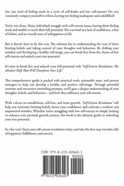 Are you tired of feeling stuck in a cycle of self-doubt and low self-esteem? Do you constantly compare yourself to others, leaving you feeling inadequate and unfulfilled? You're not alone. Many individuals struggle with self-esteem issues, leaving them feeling stuck and unable to reach their full potential. This can lead to a lack of confidence, a fear of failure, and an overall sense of unhappiness in life. But it doesn't have to be this way. The solution lies in understanding the root of these limiting beliefs and taking control of your thoughts and behaviors. By shifting your mindset and developing a healthy self-image, you can break free from the chains of low self-esteem and unlock your true potential. It's time to break free and unleash your full potential with "Self-Esteem Revolution: The Mindset Shift That Will Transform Your Life." This comprehensive guide is packed with practical tools, actionable steps, and proven strategies to help you develop a healthy and positive self-image. Through powerful exercises and interactive journaling prompts, you'll gain a deeper understanding of your thoughts, beliefs, and behaviors – and how they influence your self-esteem. With a focus on mindfulness, self-love, and inner growth, "Self-Esteem Revolution" will help you overcome limiting beliefs, boost your confidence, and cultivate a resilient and empowered mindset. Whether you're struggling with low self-esteem or simply looking to enhance your personal growth journey, this book is the ultimate guide to unlocking your true potential. So why wait? Start your self-esteem revolution today, and take the first step towards a life of happiness, fulfillment, and success!