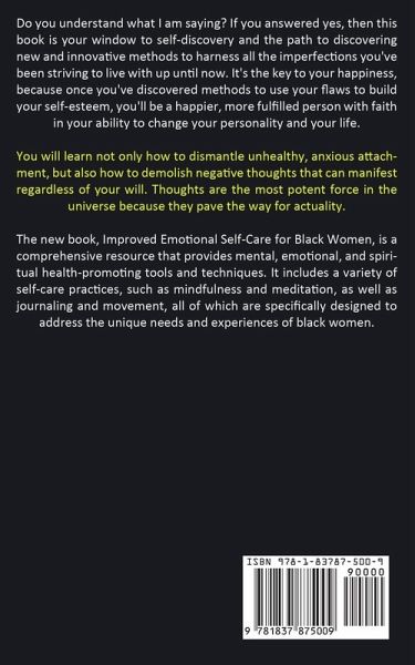 Do you understand what I am saying? If you answered yes, then this book is your window to self-discovery and the path to discovering new and innovative methods to harness all the imperfections you've been striving to live with up until now. It's the key to your happiness, because once you've discovered methods to use your flaws to build your self-esteem, you'll be a happier, more fulfilled person with faith in your ability to change your personality and your life. You will learn not only how to dismantle unhealthy, anxious attachment, but also how to demolish negative thoughts that can manifest regardless of your will. Thoughts are the most potent force in the universe because they pave the way for actuality. The new book, Improved Emotional Self-Care for Black Women, is a comprehensive resource that provides mental, emotional, and spiritual health-promoting tools and techniques. It includes a variety of self-care practices, such as mindfulness and meditation, as well as journaling and movement, all of which are specifically designed to address the unique needs and experiences of black women.