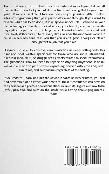 The unfortunate truth is that the critical internal monologue that we all have is the product of years of destructive conditioning that began in our youth. It may seem difficult to undo; how can you possibly battle the decades of programming that your personality went through? If you want to reverse what has been done, it may appear impossible. Everyone in your life, including your family, your instructors, your friends, and even your siblings, played a part in this. This began when the individual was an infant and most likely still occurs up to this very day. Consider the emotional wound it causes when someone tells you that you aren't good enough or clever enough for the job that you have. Discover the keys to effective communication in every setting with this hands-on book written specifically for those who are more introverted, have less social skills, or struggle with anxiety related to social interactions. The guidebook "How to Speak to Anyone on Anything Anywhere" is an invaluable ally on the path toward expressing oneself with precision, self-assurance, and composure, regardless of the setting. If you read this book and put the advice it contains into practice, you will find how much of an effect your newly found self-confidence can have on the personal and professional connections in your life. Figure out how to be joyful, peaceful, and calm on the inside while having challenging interactions.