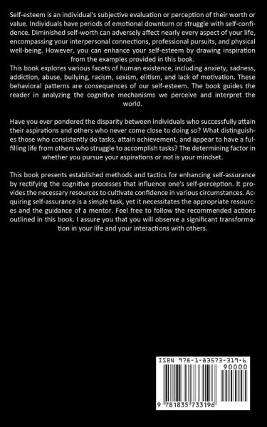 Self-esteem is an individual's subjective evaluation or perception of their worth or value. Individuals have periods of emotional downturn or struggle with self-confidence. Diminished self-worth can adversely affect nearly every aspect of your life, encompassing your interpersonal connections, professional pursuits, and physical well-being. However, you can enhance your self-esteem by drawing inspiration from the examples provided in this book. This book explores various facets of human existence, including anxiety, sadness, addiction, abuse, bullying, racism, sexism, elitism, and lack of motivation. These behavioral patterns are consequences of our self-esteem. The book guides the reader in analyzing the cognitive mechanisms we perceive and interpret the world. Have you ever pondered the disparity between individuals who successfully attain their aspirations and others who never come close to doing so? What distinguishes those who consistently do tasks, attain achievement, and appear to have a fulfilling life from others who struggle to accomplish tasks? The determining factor in whether you pursue your aspirations or not is your mindset. This book presents established methods and tactics for enhancing self-assurance by rectifying the cognitive processes that influence one's self-perception. It provides the necessary resources to cultivate confidence in various circumstances. Acquiring self-assurance is a simple task, yet it necessitates the appropriate resources and the guidance of a mentor. Feel free to follow the recommended actions outlined in this book. I assure you that you will observe a significant transformation in your life and your interactions with others.