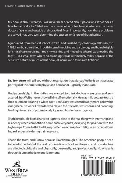 Dr. Tom Arno will tell you without reservation that Marcus Welby is an inaccurate portrayal of the American physician's demeanor-grossly inaccurate. Understandably, in the sixties, we wanted to think doctors were calm and self-assured, but Welby never showed himself emotionally. He was milquetoast-toast, a shoe salesman wearing a white coat. Ben Casey was considerably more believable if only because Vince Edwards, who played the title role, was intense and brooding, lending him an air of professional pique and borderline arrogance. Truth be told, ole Ben's character is pretty close to the real thing with internship and residency when competition fierce and everyone's jockeying for position with the higher-ups. Come to think of it, maybe Ben was cranky from fatigue, an occupational hazard, especially during training years. That is the truth, and I know because I lived through it. The American people need to be informed about the reality of medical school and beyond and how doctors are affected spiritually and physically, personally, and professionally. No one sails through it unscathed; no one is immune.