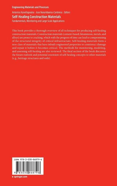 Fundamentals of self-healing construction materials.- Microencapsulation.- Bacteria based composites.- Shape memory polymers.- Flow networks.- Macrocapsules.- Autogenic approaches.- Metals and alloys.- Monitoring self-healing in construction materials.- Methods for monitoring recovery of mechanical properties.- Techniques for monitoring durability recovery.- Case Studies.