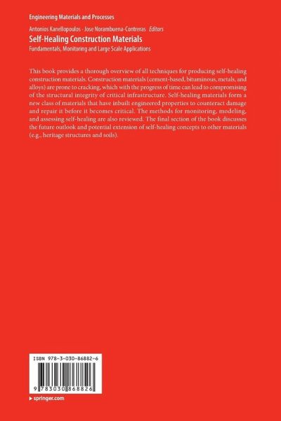 Fundamentals of self-healing construction materials.- Microencapsulation.- Bacteria based composites.- Shape memory polymers.- Flow networks.- Macrocapsules.- Autogenic approaches.- Metals and alloys.- Monitoring self-healing in construction materials.- Methods for monitoring recovery of mechanical properties.- Techniques for monitoring durability recovery.- Case Studies.