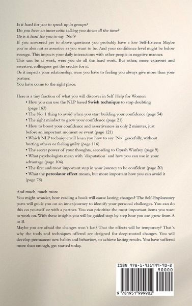 Is it hard for you to speak up in groups? Do you have an inner critic talking you down all the time? Or is it hard for you to say ¿Nö? Then keep reading A low Self-Esteem or assertiveness level can impact your daily interactions with other people negatively. This can be at work, where you do all the hard work, but other, more extroverted and assertive colleagues, get the credits for it. Or in your relationship, where you feel you always give more than your partner. Here is a tiny fraction of what you will discover in Self Help for Women:How to stop doubting and eliminate negative thoughts by using a special NLP technique (page 163) The right mindset to grow your confidence (page 21) The No. 1 thing to avoid when you start building your confidence (page 54) Which NLP technique will learn you how to say ¿Nö gracefully, without hurting others or feeling guilty (page 116) How to boost your confidence and assertiveness in only 2 minutes, just before an important moment or event. And how to do this without other people noticing it. (page 121) The influence of your thoughts on your Self-Confidence according to Oprah Winfrey (page 9) How to change your inner beliefs with this method used by psychologists (page 104) The first and most important step in your journey to be confident (page 20) What the percolator effect means, but more importantly how you can avoid it (page 78) And much, much more Self Help for Women is designed to help you develop new habits and behaviors that will stick. You might wonder, how reading a book will cause lasting changes? The Self-Exploratory parts will guide you on an inner journey to identify your personal challenges. You can do this on yourself or with a partner. You can prioritize the most important items you want to work on. With these insights you will be guided step-by-step how you can grow from A to B. Imagine yourself without anxiety to speak up, without stress to say no to your boss and not nervous to meet new people. You have suffered more than enough, so start improving your life by scrolling up and clicking ¿Add to Cart¿.