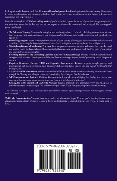 In this profound collection, you'll find 50 beautifully crafted poems that delve deep into the heart of anxiety, illuminating its roots, manifestations, and pathways to healing. Each chapter serves as a step forward on the path to self-awareness, acceptance, and empowerment. From the opening lines of "Understanding Anxiety," you're invited to explore the nature of your fears, recognizing anxiety not as an insurmountable foe but as a part of your experience that can be understood and managed. The poems gently guide you through:The Science of Anxiety: Uncover the biological and psychological aspects of anxiety, helping you make sense of your body's responses and reactions. Discover how "a signal sparks within your mind" and learn to work with your body, not against it. Identifying Triggers: Learn to recognize the sources of your anxiety, allowing you to address them with clarity and confidence. By "tracing the threads of the mental chain," you can begin to untangle the knots that hold you back. Mindfulness Basics and Meditation Practices: Discover present-moment awareness techniques that calm the mind and anchor you in the here and now. Through mindful breathing and meditation, you'll find "the quiet of your mind" and a refuge from racing thoughts. Breathing Techniques and Grounding Exercises: Find immediate relief through practical tools that ease tension and bring you back to center. Simple practices help you "breathe in courage, let fears subside," grounding you in the present moment. Cognitive Behavioral Therapy (CBT) and Cognitive Restructuring: Reframe negative thought patterns and transform self-talk into a supportive inner dialogue. Challenge the stories anxiety tells and "rewrite the thoughts that bring you pain." Acceptance and Commitment: Embrace discomfort and learn to live with uncertainty, fostering resilience and inner strength. By "leaning into what you cannot see," you develop the courage to face the unknown. Self-Compassion and Patience: Cultivate kindness toward yourself, acknowledging that healing is a process that takes time. Embrace your journey, recognizing that "growth is not always a straight line." Finding Joy in the Present and Gratitude Practices: Practice appreciation to counteract worry and find peace in everyday moments. By focusing on "the little moments you can find," you shift your perspective toward positivity. At over 10,000 words, this collection is designed to be a companion you can return to time and again, finding new layers of meaning and support with each read. "Self-Help Poetry 3: Anxiety" is more than just a book-it's a beacon of hope. Whether you're battling chronic worry, experiencing panic attacks, or simply seeking a deeper understanding of yourself, these poems provide a gentle hand to hold. Imagine transforming your relationship with anxiety, learning to navigate social situations with confidence, and embracing imperfection as part of your journey. With themes ranging from managing panic attacks to developing emotional awareness, this book covers a comprehensive path toward mental wellness. Embark on a poetic journey to healing. Let these verses guide you through the labyrinth of anxiety toward a place of calm and self-discovery.