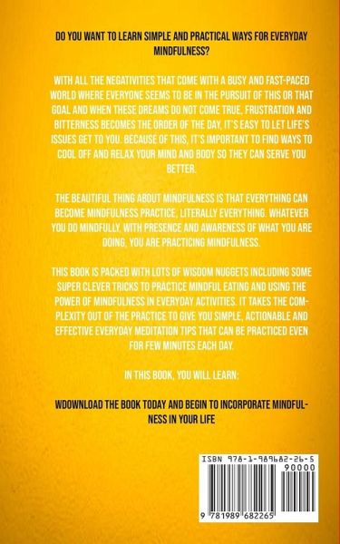 Do you want to learn simple and practical ways for everyday mindfulness? With all the negativities that come with a busy and fast-paced world where everyone seems to be in the pursuit of this or that goal and when these dreams do not come true, frustration and bitterness becomes the order of the day, it’s easy to let life’s issues get to you. Because of this, it’s important to find ways to cool off and relax your mind and body so they can serve you better. The beautiful thing about mindfulness is that everything can become mindfulness practice, literally everything. Whatever you do mindfully, with presence and awareness of what you are doing, you are practicing mindfulness. This book is packed with lots of wisdom nuggets including some super clever tricks to practice mindful eating and using the power of mindfulness in everyday activities. It takes the complexity out of the practice to give you simple, actionable and effective everyday meditation tips that can be practiced even for few minutes each day. In this book, you will learn: What mindfulness is all about Learn the difference between mindfulness and meditation Learn how to meditate for mindful awareness Mindful practices can benefit you mentally, physically, and socially Distinctions between traditional Eastern approaches and modern Western approaches Practical everyday tips to train yourself in mindfulness and many more... Download the book today and begin to incorporate mindfulness in your life.