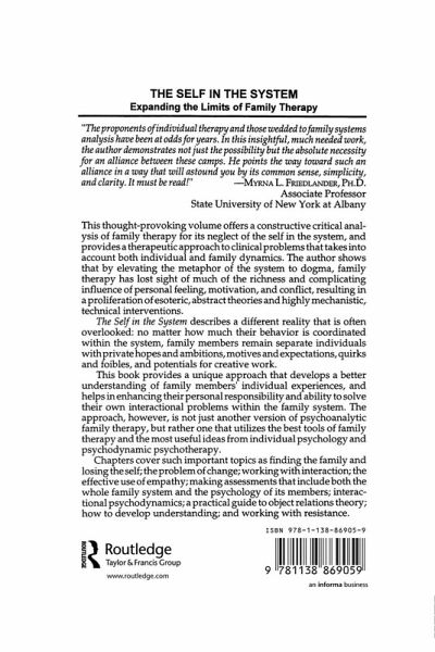 First published in 1988. This thought-provoking volume offers a constructive critical analysis of family therapy for its neglect of the self in the system, and provides a therapeutic approach to clinical problems that takes into account both individual and family dynamics. The author shows that by elevating the metaphor of the system to dogma, family therapy has lost sight of much of the richness and complicating influence of personal feeling, motivation, and conflict, resulting in a proliferation of esoteric, abstract theories and highly mechanistic, technical interventions. The Self in the System describes a different reality that is often overlooked: no matter how much their behavior is coordinated within the system, family members remain separate individuals with private hopes and ambitions, motives and expectations, quirks and foibles, and potentials for creative work. This book provides a unique approach that develops a better understanding of family members' individual experiences, and helps in enhancing their personal responsibility and ability to solve their own interactional problems within the family system. The approach, however, is not just another version of psychoanalytic family therapy, but rather one that utilizes the best tools of family therapy and the most useful ideas from individual psychology and psychodynamic psychotherapy. Chapters cover such important topics as finding the family and losing the self; the problem of change; working with interaction; the effective use of empathy; making assessments that include both the whole family system and the psychology of its members; interactional psychodynamics; a practical guide to object relations theory; how to develop understanding; and working with resistance.