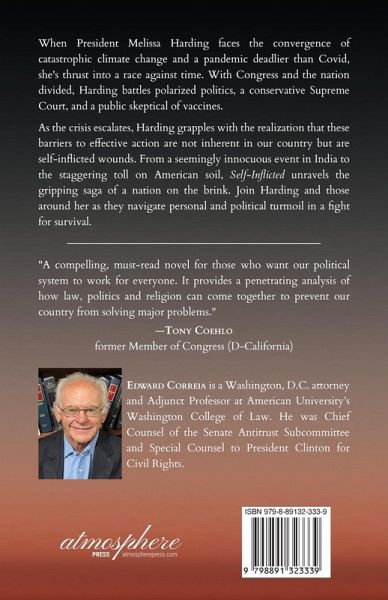 When President Melissa Harding faces the convergence of catastrophic climate change and a pandemic deadlier than Covid, she's thrust into a race against time. With Congress and the nation divided, Harding battles polarized politics, a conservative Supreme Court, and a public skeptical of vaccines. As the crisis escalates, Harding grapples with the realization that these barriers to effective action are not inherent in our country but are self-inflicted wounds. From a seemingly innocuous event in India to the staggering toll on American soil, Self-Inflicted unravels the gripping saga of a nation on the brink. Join Harding and those around her as they navigate personal and political turmoil in a fight for survival. "A compelling, must-read novel for those who want our political system to work for everyone. It provides a penetrating analysis of how law, politics and religion can come together to prevent our country from solving major problems." - Tony Coehlo, former Member of Congress (D-California)
