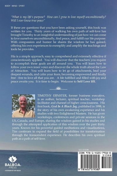 "What is my life’s purpose? How can I grow to love myself unconditionally? Will I ever know true peace" If these are questions that you have been asking yourself, this book was written for you. Thirty years of walking his own path of self-love has brought Timothy to an insightful understanding of just how we can come to love ourselves unconditionally, find peace, and fulfill our life purpose. With compassion and humor he shares the wisdom he has gained, offering his own experiences to exemplify and amplify the teachings and tools he provides. His is a simple approach, easy to comprehend and extremely effective if conscientiously applied. You will discover that the teachers you require to accomplish these goals are all around you. You will learn how to follow your own inner voice and discover the whole truth about the Law of Attraction. You will learn how to let go of attachments, heal your deepest wounds, and calm your fears, becoming empowered and finally free - free to love all that you are. A life fulfilled and filled with joy and peace awaits you. It is time to begin. Welcome to Self Love 101.