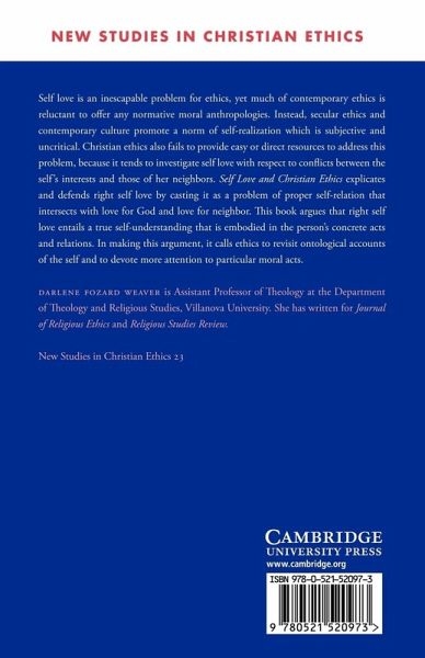 Self love is an inescapable problem for ethics, yet much of contemporary ethics is reluctant to offer any normative moral anthropologies. Instead, secular ethics and contemporary culture promote a norm of self-realization which is subjective and uncritical. Christian ethics also fails to address this problem directly, because it tends to investigate self love within the context of conflicts between the self's interests and those of her neighbors. Self Love and Christian Ethics argues for right self love as the solution of proper self-relation that intersects with love for God and love for neighbor. Darlene Fozard Weaver explains that right self love entails a true self-understanding that is embodied in the person's concrete acts and relations. In making this argument, she calls upon ethicists to revisit ontological accounts of the self and to devote more attention to particular moral acts.