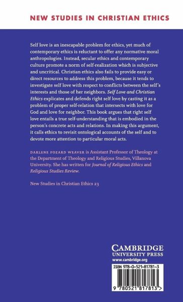 Self love is an inescapable problem for ethics, yet much of contemporary ethics is reluctant to offer any normative moral anthropologies. Instead, secular ethics and contemporary culture promote a norm of self-realization which is subjective and uncritical. Christian ethics also fails to address this problem directly, because it tends to investigate self love within the context of conflicts between the self's interests and those of her neighbors. Self Love and Christian Ethics argues for right self love as the solution of proper self-relation that intersects with love for God and love for neighbor. Darlene Fozard Weaver explains that right self love entails a true self-understanding that is embodied in the person's concrete acts and relations. In making this argument, she calls upon ethicists to revisit ontological accounts of the self and to devote more attention to particular moral acts.