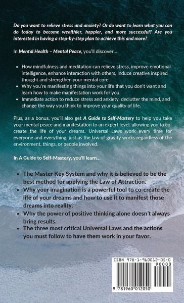 Do you want to relieve stress and anxiety? Or do want to learn what you can do today to become wealthier, happier, and more successful? Are you interested in having a step-by-step plan to achieve this and more? Are you mildly stressed or have anxiety? Are you further down the rabbit hole with stress, anxiety, depression, or other emotional challenges? Or do you want advice on how to take your life and happiness to the next level? There is a wide variety of areas of improvement regarding mental health and Mental Health - Mental Peace is a resource, regardless of where you are in your journey, that can travel with you as you continue to grow or stumble and that you can rely upon to support mental health and to give you the tools to lead a happier more fulfilling life. The body and mind cannot live different lives, and distress in the mind leads to distress in the body. Do you have high blood pressure or excess fat around the midsection? Can you believe it may be because of your mental health? If it's time to co-create a better, less stressful, more fulfilling life. In Mental Health - Mental Peace, you'll discover... How mindfulness and meditation can relieve stress, improve emotional intelligence, enhance interaction with others, induce creative inspired thought and strengthen your mental core. How to experience the enjoyment and growth that occurs when you break through your self-imposed limitations. Why you're manifesting things into your life that you don't want and learn how to make manifestation work for you. Immediate action to reduce stress and anxiety, declutter the mind, and change the way you think to improve your quality of life. Plus, as a bonus, you'll also get A Guide to Self-Mastery to help you take your mental peace and manifestation to an expert level, allowing you to co-create the life of your dreams. Universal Laws work every time for everyone and everything, just as the law of gravity works regardless of the environment, things, or people involved. When you understand these Universal Laws and what is necessary to have them work for your benefit, you can attract things into your life that you've only dreamed of. In A Guide to Self-Mastery, you'll learn... The Master Key System and why it is believed to be the best method for applying the Law of Attraction. Why your imagination is a powerful tool to co-create the life of your dreams and how to use it to manifest those dreams into reality. Why doesn't the power of positive thinking alone bring results. The three most critical Universal Laws and the actions you must follow to have them work in your favor. Suppose you've tried other self-help books focusing on the Law of Attraction and the power of positive thinking without success. It's likely because they have neglected to implement one of the Universal Laws that, when lacking, prevents the use of the magnificent power of the Universe to help you achieve your goals. Learn how to break through these barriers to accomplish your heart's desires.
