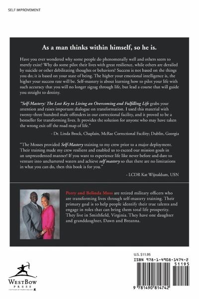As a man thinks within himself, so he is. Have you ever wondered why some people do phenomenally well and others seem to merely exist? Why do some pilot their lives with great resilience, while others are derailed by suicide or other debilitating thoughts or behaviors? Success is not based on the things you do; it is based on your state of being. The higher your emotional intelligence is, the higher your success rate will be. Self-mastery is about learning how to pilot your life with such accuracy that you will no longer zigzag through life, but lead a course that will guide you straight to destiny. "Self-Mastery: The Lost Key to Living an Overcoming and Fulfilling Life grabs your attention and raises important dialogue on transformation. I used this material with twenty-three hundred male offenders in our correctional facility, and it proved to be a bestseller for transforming lives. It provides the solution for anyone who may have taken the wrong exit off the road map of life." - Dr. Linda Brock, Chaplain, McRae Correctional Facility; Dublin, Georgia "The Mosses provided Self-Mastery training to my crew prior to a major deployment. Their training made my crew resilient and enabled us to exceed our mission goals in an unprecedented manner! If you want to experience life like never before and dare to venture into unchartered waters and achieve self mastery so that there are no limitations in what you can do, then this book is for you." - LCDR Kat Wijnaldum, USN