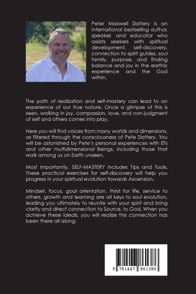 The path of realization and self-mastery can lead to an experience of our true nature. Once a glimpse of this is seen, walking in joy, compassion, love, and non-judgment of self and others comes into play. Here you will find voices from many worlds and dimensions, as filtered through the consciousness of Pete Slattery. You will be astonished by Pete's personal experiences with ETs and other multidimensional Beings, including those that walk among us on Earth unseen. Most importantly, SELF-MASTERY includes Tips and Tools. These practical exercises for self-discovery will help you progress in your spiritual evolution towards Ascension. Mindset, focus, goal orientation, thirst for life, service to others, growth and learning are all keys to soul evolution, leading you ultimately to reunite with your spirit and bring clarity and direct connection to Source, to God. When you achieve these ideals, you will realize this connection has been there all along.