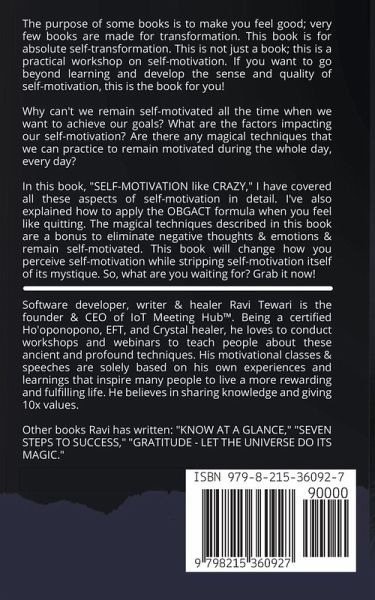 The purpose of some books is to make you feel good; very few books are made for transformation. This book is for absolute self-transformation. This is not just a book; this is a practical workshop on self-motivation. I know that we get carried away by our negative emotions and feelings most of the time. I also understand that many of us learn, practice, and gain knowledge about self-motivation, but we forget to implement all that knowledge in the hour of need.So why does this happen? Why can't we remain self-motivated all the time when we want to achieve our goals? Are there any magical techniques that we can practice to remain motivated during the whole day, every day? In this book, "SELF-MOTIVATION like CRAZY," I have covered all these aspects of self-motivation in detail. The examples & exercises covered in this book are authentic and based on my personal experiences & extensive research over many years. You will learn:How you can celebrate "small wins" and stay motivated How you can apply my OBGACT formula when you feel like quitting up How SMART goals help develop a sense of self-motivation To find the purpose of your life Magical techniques to be practiced daily to eliminate negative thoughts & emotions & remain self-motivated The magical techniques I'm sharing in the book are not something I invented; instead, they are ancient and used by many successful people in the world. Since they have worked for them, it should work for you and me.
