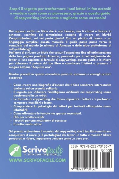 Scopri il segreto per trasformare i tuoi lettori in fan accaniti e vendere copie come se piovessero, grazie a questa guida di copywriting irriverente e tagliente come un rasoio! Hai appena scritto un libro che è una bomba, ma ti ritrovi a fissare lo schermo, sconfitto dal temutissimo compito di creare un blurb? Congratulazioni, sei nel posto giusto! Con un pizzico di humor e un linguaggio semplice, questo manuale ti guida passo passo verso la conquista del mondo (o almeno di Amazon e delle altre piattaforme di self-publishing)! Dall'arte di scrivere un blurb che catturi l'attenzione fino all'ottimizzazione della tua pagina prodotto Amazon, passando per il coinvolgimento dei lettori e l'uso sapiente di formule di copywriting, questa guida è la chiave per sbloccare il potere del tuo libro e convincere i lettori a premere il magico bottone "Acquista ora". Mentre procedi in questa avventura piena di sarcasmo e consigli pratici, scoprirai: Come creare una biografia d'autore che ti farà sembrare interessante anche se sei un eremita solitario. Il segreto per utilizzare l'intelligenza artificiale nel copywriting senza trasformarti in un robot. Le formule di copywriting che fanno impazzire i lettori e li portano a comprare i tuoi libri a frotte. Comprendere la psicologia dei lettori per invitarli all'acquisto senza infastidirli. Come affrontare le temute ma sperate recensioni. PNL per scrittori arditi I trucchi per una newsletter di successo E molto, molto altro! Sei pronto a diventare il maestro del copywriting che il tuo libro merita e a conquistare il cuore (e il portafoglio) dei lettori in tutto il mondo? Allora preparati a ridere, imparare e vendere come un vero pro.