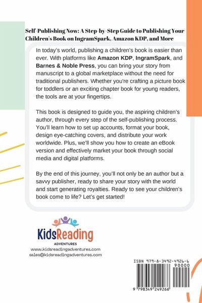 In today's world, publishing a children's book is easier than ever. With platforms like Amazon KDP, IngramSpark, and Barnes & Noble Press, you can bring your story from manuscript to a global marketplace without the need for traditional publishers. Whether you're crafting a picture book for toddlers or an exciting chapter book for young readers, the tools are at your fingertips. This book is designed to guide you, the aspiring children's author, through every step of the self-publishing process. You'll learn how to set up accounts, format your book, design eye-catching covers, and distribute your work worldwide. Plus, we'll show you how to create an eBook version and effectively market your book through social media and digital platforms. By the end of this journey, you'll not only be an author but a savvy publisher, ready to share your story with the world and start generating royalties. Ready to see your children's book come to life? Let's get started!