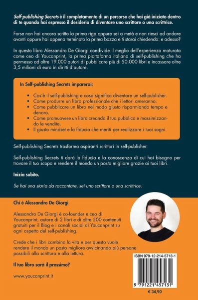 Self-publishing Secrets è il percorso più completo in Italia per tutti gli scrittori e le scrittrici che vogliono diventare Self Publisher professionisti e consapevoli. Non si tratta di un "semplice" libro formativo: Self-Publishing Secrets è un viaggio per la realizzazione dei tuoi sogni e per scrivere, pubblicare e vendere il tuo libro. Il MANUALE, che contiene più di 380 pagine dedicate alla pubblicazione e alla promozione di un libro. Ogni pagina del libro è ricca di strategie e segreti testati su oltre 19.000 Autori nel corso di questi ultimi 14 anni. Un percorso che ti prende per mano e ti accompagna attraverso i capisaldi della pubblicazione, fino ad arrivare alle migliori tecniche di promozione e vendita della tua opera, online e offline.