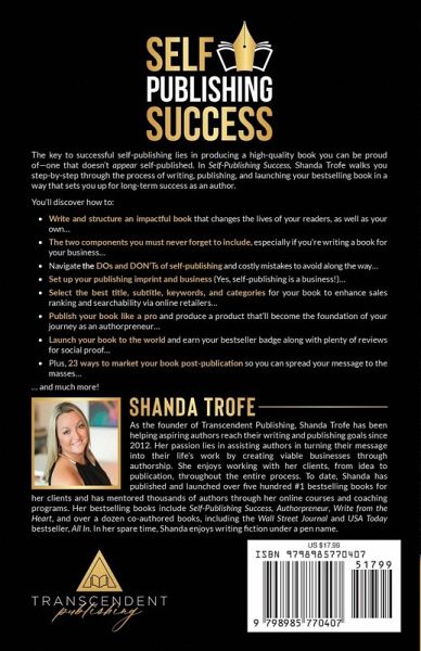 The key to successful self-publishing lies in producing a high-quality book you can be proud of-one that doesn't appear self-published. In Self-Publishing Success, Shanda Trofe walks you step-by-step through the process of writing, publishing, and launching your bestselling book in a way that sets you up for long-term success as an author. You'll discover how to:Write and structure an impactful book that changes the lives of your readers, as well as your own... The two components you must never forget to include, especially if you're writing a book for your business... Navigate the DOs and DON'Ts of self-publishing and costly mistakes to avoid along the way... Set up your publishing imprint and business (yes, self-publishing is a business!)... Select the best title, subtitle, keywords, and categories for your book to enhance sales ranking and searchability via online retailers... Publish your book like a pro and produce a product that'll become the foundation of your journey as an authorpreneur... Launch your book to the world and earn your bestseller badge along with plenty of reviews for social proof... Plus, 23 ways to market your book post-publication so you can spread your message to the masses... ... and much more! Packed with success tips and actionable steps, Self-Publishing Success is a must-read for today's indie author.