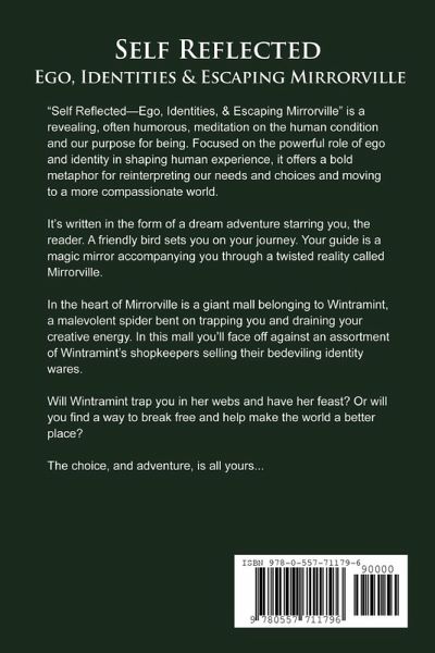 "Self Reflected - Ego, Identities, & Escaping Mirrorville" is a revealing, often humorous, meditation on the human condition and our purpose for being. Focused on the powerful role of ego and identity in shaping human experience, it offers a bold metaphor for reinterpreting our needs and choices and moving to a more compassionate world. It's written in the form of a dream adventure starring you, the reader. A friendly bird sets you on your journey. Your guide is a magic mirror accompanying you through a twisted reality called Mirrorville. In the heart of Mirrorville is a giant mall belonging to Wintramint, a malevolent spider bent on trapping you and draining your creative energy. In this mall you'll face off against an assortment of Wintramint's shopkeepers selling their bedeviling identity wares. Will Wintramint trap you in her webs and have her feast? Or will you find a way to break free and help make the world a better place? The choice, and adventure, is all yours...
