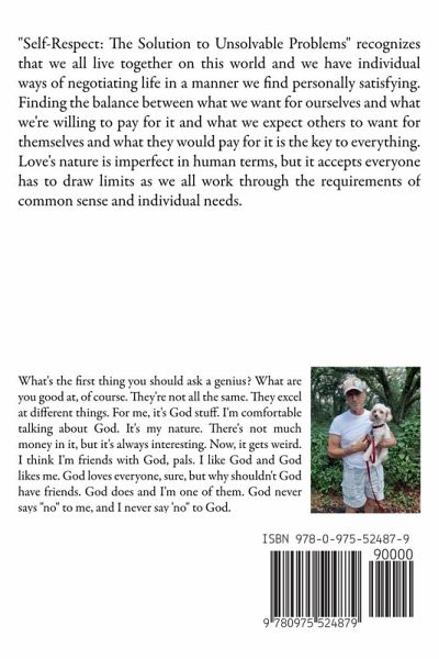 "Self-Respect: The Solution to Unsolvable Problems" recognizes that we all live together on this world and we have individual ways of negotiating life in a manner we find personally satisfying. Finding the balance between what we want for ourselves and what we're willing to pay for it and what we expect others to want for themselves and what they would pay for it is the key to everything. Love's nature is imperfect in human terms, but it accepts everyone has to draw limits as we work through the requirements of common sense and individual needs.