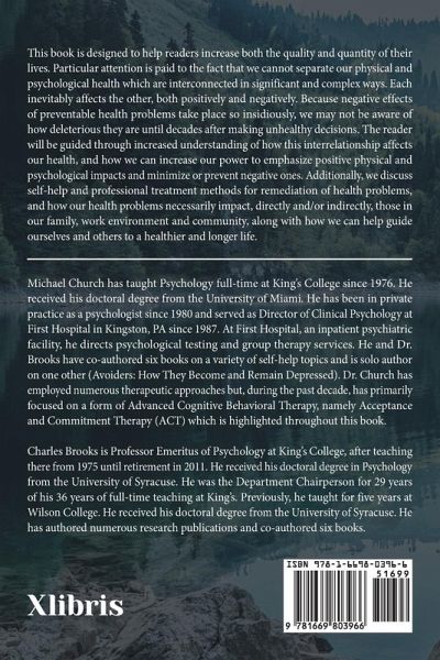 This book is designed to help readers increase both the quality and quantity of their lives. Particular attention is paid to the fact that we cannot separate our physical and psychological health which are interconnected in significant and complex ways. Each inevitably affects the other, both positively and negatively. Because negative effects of preventable health problems take place so insidiously, we may not be aware of how deleterious they are until decades after making unhealthy decisions. The reader will be guided through increased understanding of how this interrelationship affects our health, and how we can increase our power to emphasize positive physical and psychological impacts and minimize or prevent negative ones. Additionally, we discuss self-help and professional treatment methods for remediation of health problems, and how our health problems necessarily impact, directly and/or indirectly, those in our family, work environment and community, along with how we can help guide ourselves and others to a healthier and longer life.