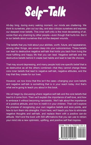 If you want to reach your fullest potential and feel better about yourself, then keep reading... Many of us go through life followed by that little voice in our head, who is our own worst enemy. We spend our days bullying ourselves, putting ourselves down and telling ourselves that we can’t do this, that we aren’t good enough, or that people don’t value us. That nasty little voice in your head may be telling you that you are stupid and not capable. You know differently, but it is hard to run away from it and the message it keeps telling you. Sadly, the negative little voice in our heads is a result of years of negative programming that started in our childhood. It might seem impossible to undo it; how can you possibly combat the decades of programming that your personality went through? Your parents, your teachers, your friends, and your siblings—they all played a role. This started in infancy and probably continues all the way to this day. Think of the way that it cuts emotionally when someone tells you that aren’t good enough or smart enough. In Self-Talk: The Ultimate Guide to Transforming Negative Thinking into Positive Thinking and Skyrocketing Self-Esteem, Confidence, Productivity, and Mental Toughness, Including 500 Daily Affirmations, you are going to learn the specific steps that you need to adopt in order to overcome the negative programming that has been holding you back for years. In this book you’ll learn: Where negative self-talk comes from, and how we form habits and behaviors from it that are holding us back. Why self-love matters – how to have a positive attitude without being a narcissist. The levels of self-talk – learn how to step from negative to positive levels of self-talk. Stop the blame game – are you always blaming yourself or others for your circumstances? Learn how to stop using blame as an excuse and make real progress. Confronting negative self-talk – learn how to recognize negative self-talk when it happens, and learn how to replace it with positive self-talk. Fostering self-esteem – learn how to see yourself as worthy and important. Emotional intelligence – find out how you can use emotional intelligence to erase negative thoughts and feelings. Strengthen the mental muscle – get tough and have your own back, and learn how to fight through adversity. 500 affirmations – this book includes 500 affirmations that you can select from to use daily, in order to foster positive thinking And much, much more! If you need to overcome the negative self-talk that has been keeping you from living the most fulfilled life that you can possibly lead, then click the add to cart button now!
