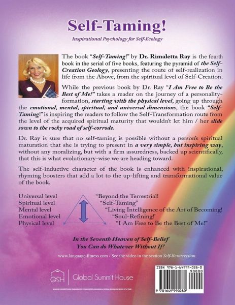 The book "Self-Taming!" by Dr. Rimaletta Ray is the fourth book in the serial of five books, featuring the pyramid of the Self-Creation Geology, presenting the route of self- realization in life from the Above, from the spiritual level of Self-Creation. While the previous book by Dr. Ray "I Am Free to Be the Best of Me!"takes a reader on the journey of a personality-formation, starting with the physical level, going up through the emotional, mental, spiritual and universal dimensions, the book "Self-Taming!" is inspiring the readers to follow the Self-Transformation route from the level of the acquired spiritual maturity that wouldn't let him/her Slide sown th the rocky of self-corrode. Dr. Ray is sure that no self-taming is possible without a person's spiritual maturation that she is trying to present in a very simple, but inspiring way, without any moralizing, but with a firm assuredness, backed up scientifically, that this is what evolutionary-wise we are heading toward. The self inductive character of the book is enhanced with inspirational, rhyming boosters that add a lot to the up-lifting and transformational value of the book.