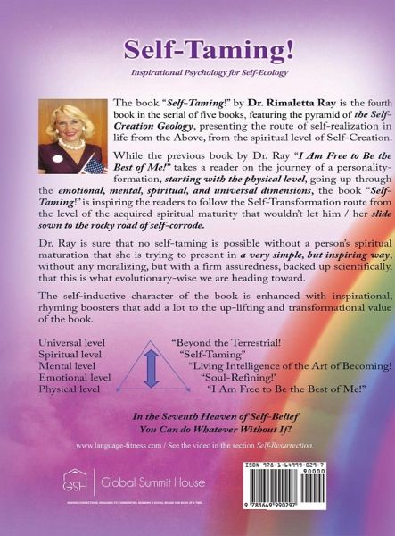 The book "Self-Taming!" by Dr. Rimaletta Ray is the fourth book in the serial of five books, featuring the pyramid of the Self-Creation Geology, presenting the route of self- realization in life from the Above, from the spiritual level of Self-Creation. While the previous book by Dr. Ray "I Am Free to Be the Best of Me!"takes a reader on the journey of a personality-formation, starting with the physical level, going up through the emotional, mental, spiritual and universal dimensions, the book "Self-Taming!" is inspiring the readers to follow the Self-Transformation route from the level of the acquired spiritual maturity that wouldn't let him/her Slide sown th the rocky of self-corrode. Dr. Ray is sure that no self-taming is possible without a person's spiritual maturation that she is trying to present in a very simple, but inspiring way, without any moralizing, but with a firm assuredness, backed up scientifically, that this is what evolutionary-wise we are heading toward. The self inductive character of the book is enhanced with inspirational, rhyming boosters that add a lot to the up-lifting and transformational value of the book.