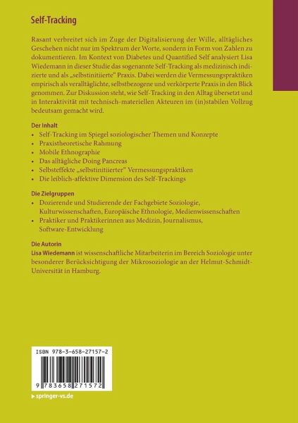 Rasant verbreitet sich im Zuge der Digitalisierung der Wille, alltägliches Geschehen nicht nur im Spektrum der Worte, sondern in Form von Zahlen zu dokumentieren. Im Kontext von Diabetes und Quantified Self analysiert Lisa Wiedemann in dieser Studie das sogenannte Self-Tracking als medizinisch indizierte und als "selbstinitiierte" Praxis. Dabei werden die Vermessungspraktiken empirisch als veralltäglichte, selbstbezogene und verkörperte Praxis in den Blick genommen. Zur Diskussion steht, wie Self-Tracking in den Alltag übersetzt und in Interaktivität mit technisch-materiellen Akteuren im (in)stabilen Vollzug bedeutsam gemacht wird.