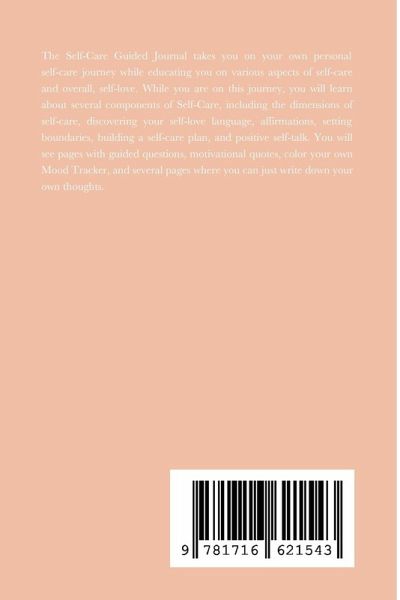 The Self-Care Guided Journal takes you on your own personal self-care journey while educating you on various aspects of self-care and overall, self-love. While you are on this journey, you will learn about several components of Self-Care, including The Dimensions of Self-Care, discovering your Self-Love Language, Affirmations, Setting Boundaries, building a self-care plan, and positive self-talk. You will see pages with guided questions, motivational quotes, color your own Mood Tracker, and several pages where you can just write down your own thoughts.
