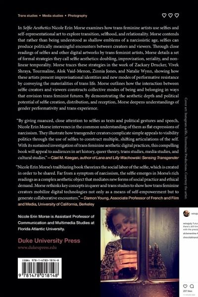 In Selfie Aesthetics Nicole Erin Morse examines how trans feminine artists use selfies and self-representational art to explore transition, selfhood, and relationality. Morse contends that rather than being understood as shallow emblems of a narcissistic age, selfies can produce politically meaningful encounters between creators and viewers. Through close readings of selfies and other digital artworks by trans feminist artists, Morse details a set of formal strategies they call selfie aesthetics: doubling, improvisation, seriality, and nonlinear temporality. Morse traces these strategies in the work of Zackary Drucker, Vivek Shraya, Tourmaline, Alok Vaid-Menon, Zinnia Jones, and Natalie Wynn, showing how these artists present improvisational identities and new modes of performative resistance by conveying the materialities of trans life. Morse shows how the interaction between selfie creators and viewers constructs collective modes of being and belonging in ways that envision trans feminist futures. By demonstrating the aesthetic depth and political potential of selfie creation, distribution, and reception, Morse deepens understandings of gender performativity and trans experience.