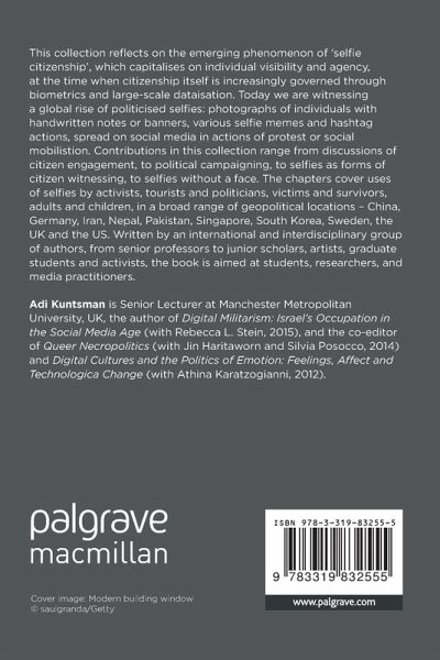 This collection reflects on the emerging phenomenon of 'selfie citizenship', which capitalises on individual visibility and agency, at the time when citizenship itself is increasingly governed through biometrics and large-scale dataisation. Today we are witnessing a global rise of politicised selfies: photographs of individuals with handwritten notes or banners, various selfie memes and hashtag actions, spread on social media in actions of protest or social mobilistion. Contributions in this collection range from discussions of citizen engagement, to political campaigning, to selfies as forms of citizen witnessing, to selfies without a face. The chapters cover uses of selfies by activists, tourists and politicians, victims and survivors, adults and children, in a broad range of geopolitical locations -China, Germany, Iran, Nepal, Pakistan, Singapore, South Korea, Sweden, the UK and the US. Written by an international and interdisciplinary group of authors, from senior professors to junior scholars, artists, graduate students and activist, the book is aimed at students, researchers, and media practitioners.