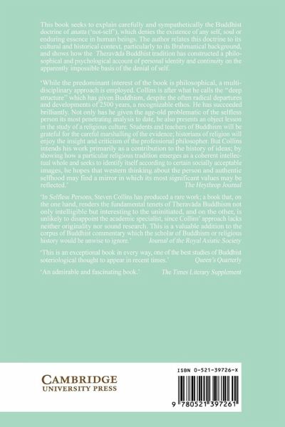 This book explains the Buddhist doctrine of annattá("not-self"), which denies the existence of any self, soul, or enduring essence in man. The author relates this doctrine to its cultural and historical context, particularly to its Brahman background. He shows how the Theravada Buddhist tradition has constructed a philosophical and psychological account of personal identity on the apparently impossible basis of the denial of self. Although the emphasis of the book is firmly philosophical, Dr. Collins makes use of a number of academic disciplines, particularly those of anthropology, linguistics, sociology, and comparative religion, in an attempt to discover the "deep structure" of Buddhist culture and imagination, and to make these doctrines comprehensible in terms of the western history of ideas.