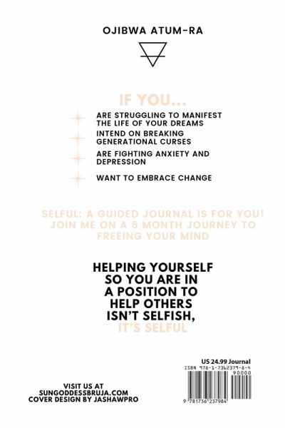 This life changing guided journal is a companion to the book Selful: A Beginner's Guide to Mental Alchemy Through Becoming Selful, you'll learn- why values, morals, & integrity ARE key! why boundaries are essential to growth How to observe your mental and emotional processes How to become the master of your own UNIverse and manifest the life of your dreams & much more If you are looking to embrace change, this is the journal for you! Join me on a 6 month journey to freeing your mind. Helping yourself so you are in a position to help others isn't selfish, it's selful