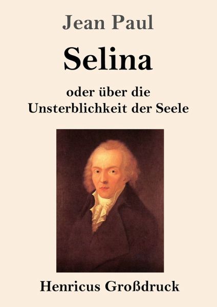 Jean Paul: Selina oder über die Unsterblichkeit der Seele Lesefreundlicher Großdruck in 16-pt-Schrift Großformat, 210 x 297 mm Berliner Ausgabe, 2025 Durchgesehener Neusatz bearbeitet und eingerichtet von Theodor Borken Begonnen am 27. April 1823. Posthum herausgegeben von Christian Georg Otto, Stuttgart, Cotta'sche Verlagsbuchhandlung, 1827. Umschlagabbildung: Jean Paul (Gemälde von Heinrich Pfenninger, 1798) Gesetzt aus der Minion Pro, 16 pt. Henricus - Edition Deutsche Klassik GmbH Über den Autor: 1763 als Sohn eines Pfarrers in Wunsiedel geboren, bricht Johann Paul Friedrich Richter das in Leipzig begonnene Theologiestudium ab und versucht sich unter kargen wirtschaftlichen Bedingungen als satirischer Dichter. 1790 ereilt ihn eine sogenannte Todesvision, deren emotionale Auswirkung ihn nachhaltig prägt. Aus Verehrung für Jean-Jacques Rousseau veröffentlicht er unter dem Pseudonym »Jean Paul« sein erstes größeres Werk: »Die unsichtbare Loge«. Dem Achtungserfolg folgt 1795 der endgültige Durchbruch mit dem Erziehungsroman »Hesperus«. Jean Paul schreibt in rascher Folge weitere große Romane, »Siebenkäs«, »Titan«, und schließlich seinen größten Erfolg, die »Flegeljahre«, die großen Anklang, vor allem beim weiblichen Publikum finden. Königin Luise lädt ihn nach Potsdam ein, er begegnet Fichte, Schleiermacher, Friedrich Schlegel, Tieck und Bernhardi und lebt auf Einladung von Goethe und Schiller zeitweise in Weimar. Er wird Ehrenmitglied des Frankfurter »Museums«, Mitglied der Berlinischen Gesellschaft für deutsche Sprache, Ehrenmitglied der Bayerischen Akademie der Wissenschaften und die Universität Heidelberg verleiht ihm die Ehrendoktorwürde. 1825 stirbt Jean Paul fast völlig erblindet in Bayreuth.
