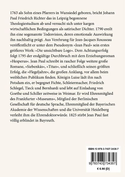 1763 als Sohn eines Pfarrers in Wunsiedel geboren, bricht Johann Paul Friedrich Richter das in Leipzig begonnene Theologiestudium ab und versucht sich unter kargen wirtschaftlichen Bedingungen als satirischer Dichter. 1790 ereilt ihn eine sogenannte Todesvision, deren emotionale Auswirkung ihn nachhaltig prägt. Aus Verehrung für Jean-Jacques Rousseau veröffentlicht er unter dem Pseudonym "Jean Paul" sein erstes größeres Werk: "Die unsichtbare Loge". Dem Achtungserfolg folgt 1795 der endgültige Durchbruch mit dem Erziehungsroman "Hesperus". Jean Paul schreibt in rascher Folge weitere große Romane, "Siebenkäs", "Titan", und schließlich seinen größten Erfolg, die "Flegeljahre", die großen Anklang, vor allem beim weiblichen Publikum finden. Königin Luise lädt ihn nach Potsdam ein, er begegnet Fichte, Schleiermacher, Friedrich Schlegel, Tieck und Bernhardi und lebt auf Einladung von Goethe und Schiller zeitweise in Weimar. Er wird Ehrenmitglied des Frankfurter "Museums", Mitglied der Berlinischen Gesellschaft für deutsche Sprache, Ehrenmitglied der Bayerischen Akademie der Wissenschaften und die Universität Heidelberg verleiht ihm die Ehrendoktorwürde. 1825 stirbt Jean Paul fast völlig erblindet in Bayreuth.