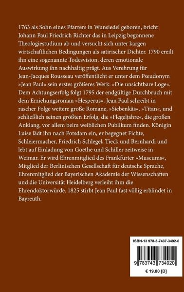 1763 als Sohn eines Pfarrers in Wunsiedel geboren, bricht Johann Paul Friedrich Richter das in Leipzig begonnene Theologiestudium ab und versucht sich unter kargen wirtschaftlichen Bedingungen als satirischer Dichter. 1790 ereilt ihn eine sogenannte Todesvision, deren emotionale Auswirkung ihn nachhaltig prägt. Aus Verehrung für Jean-Jacques Rousseau veröffentlicht er unter dem Pseudonym "Jean Paul" sein erstes größeres Werk: "Die unsichtbare Loge". Dem Achtungserfolg folgt 1795 der endgültige Durchbruch mit dem Erziehungsroman "Hesperus". Jean Paul schreibt in rascher Folge weitere große Romane, "Siebenkäs", "Titan", und schließlich seinen größten Erfolg, die "Flegeljahre", die großen Anklang, vor allem beim weiblichen Publikum finden. Königin Luise lädt ihn nach Potsdam ein, er begegnet Fichte, Schleiermacher, Friedrich Schlegel, Tieck und Bernhardi und lebt auf Einladung von Goethe und Schiller zeitweise in Weimar. Er wird Ehrenmitglied des Frankfurter "Museums", Mitglied der Berlinischen Gesellschaft für deutsche Sprache, Ehrenmitglied der Bayerischen Akademie der Wissenschaften und die Universität Heidelberg verleiht ihm die Ehrendoktorwürde. 1825 stirbt Jean Paul fast völlig erblindet in Bayreuth.