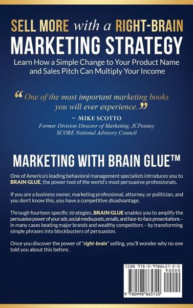 **Editor's Pick** from Booklife by Publishers Weekly ***Readers' Favorite 5-Star Award Winner*** "This book is terrific. It lives up to its promise and more. I could hardly put the book down after I started reading it." - Joe Wisinski for Readers' Favorite "A strategy-packed business marketing guide..." - BookLife for Publishers Weekly Welcome to BRAIN GLUE¿, the secret to making your ideas "sticky" so they stick to your prospect's brain like glue, raising the persuasive power of your ads, emails, social media posts, and one-on-one presentations. Want an easier way to get people to buy your products and say YES to your ideas? Then you need to keep reading... People buy for emotional reasons. Yet "emotional selling" is missing from most marketing. That's why so many pros are now using BRAIN GLUE¿ to boost the performance of their ads, emails, social media posts, and one-on-one presentations. "This is one of the most important marketing books you will ever read!" -Mike Scotto, Former Div. Director of Marketing, JCPenney Based on sold-out workshops at the US Small Business Administration, here's how top marketers turn ordinary products into blockbusters (with little or no cost)! Consider this. What do the phrase, "If the glove don't fit you must acquit," and the product name, "Squatty Potty," have in common? More than you probably realize. Both have achieved incredible success by tapping into the right side of their audiences' brains. How can YOU do the same? This is what I am going to show you. I think you'll be surprised at how easy and powerful this can be. The Answer Is "Right-Brain" Selling Right-brain selling triggers the emotion centers of the brain, where decisions are made, making it easier to get your prospects to say yes to just about any product or idea you have. Top marketers, attorneys, and politicians depend on it while limiting access, for fear competitors will use it against them. But that's about to change for you. Each of the 14 strategies you are about to discover has the power to catapult your results into the stratospheres of success that you've always wanted to reach. Here's a sampling of what's included:How a broke entrepreneur skyrocketed his income past giant competitors with a simple change to the name of his product A trick top attorneys use that transforms fence-sitters into rabid fans How a woman with no business experience shot past male-dominated competitors by applying uncommon logic to her business When a "logical" presentation may be the wrong approach to winning sales Five words that establish instant credibility, even with tough customers How to avoid "trigger" words that sabotage your ads and sales pitch A simple twist to WHAT you say that magnifies your power of persuasion "Shock Words" that stimulate the emotion center of your prospect's brain How a TURN-OFF can be the greatest TURN-ON for your prospect Five ways to "surprise" your prospect into buying from you And more! Once you experience it, you'll wonder why no one told you about this before! So, if you want an easier way to get people to buy your products and say YES to your ideas... then scroll up and click the "Add to Cart" button now!