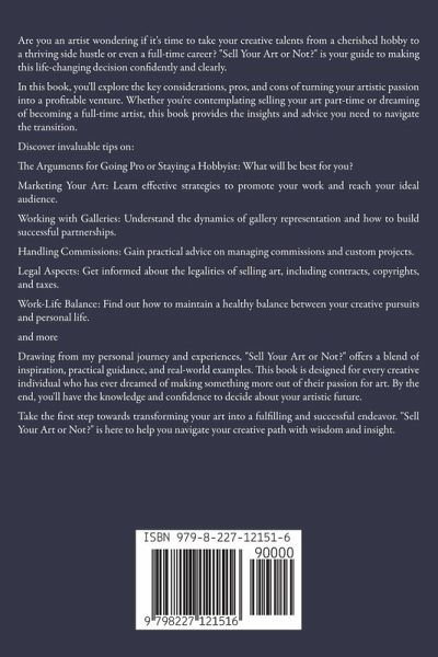 Are you an artist wondering if it's time to take your creative talents from a cherished hobby to a thriving side hustle or even a full-time career? "Sell Your Art or Not?" is your guide to making this life-changing decision confidently and clearly. In this book, you'll explore the key considerations, pros, and cons of turning your artistic passion into a profitable venture. Whether you're contemplating selling your art part-time or dreaming of becoming a full-time artist, this book provides the insights and advice you need to navigate the transition. Discover invaluable tips on: The Arguments for Going Pro or Staying a Hobbyist: What will be best for you? Marketing Your Art: Learn effective strategies to promote your work and reach your ideal audience. Working with Galleries: Understand the dynamics of gallery representation and how to build successful partnerships. Handling Commissions: Gain practical advice on managing commissions and custom projects. Legal Aspects: Get informed about the legalities of selling art, including contracts, copyrights, and taxes. Work-Life Balance: Find out how to maintain a healthy balance between your creative pursuits and personal life. and more Drawing from my personal journey and experiences, "Sell Your Art or Not?" offers a blend of inspiration, practical guidance, and real-world examples. This book is designed for every creative individual who has ever dreamed of making something more out of their passion for art. By the end, you'll have the knowledge and confidence to decide about your artistic future. Take the first step towards transforming your art into a fulfilling and successful endeavor. "Sell Your Art or Not?" is here to help you navigate your creative path with wisdom and insight.