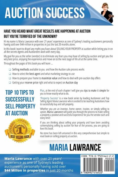 HAVE YOU HEARD WHAT GREAT RESULTS ARE HAPPENING AT AUCTION BUT YOU'RE TERRIFIED OF THE UNKNOWN? Hi my name is Maria Lawrance with over 21 years' experience as one of Sydney's leading auctioneers personally having sold over $44 million in properties in just the last 20 months alone. In this book I want to dispel any myths you have about SELLING YOUR PROPERTY at auction while letting you in on all the secrets Agents and Auctioneers work with every day. My goal for you as the seller (vendor) is to eliminate any fears you may have of selling by auction and get you the very best price, enjoying the experience and move on to the next stage of life all at the same time. Throughout the pages of this book you will learn ... -Selling methods available to you -How the Auction sale process works -How to select the best agent -What marketing strategy to use -How to prepare your home to maximize value -How to deal with pre-auction day offers -Getting your reserve price right -What to expect on Auction day Plus, at the end of each chapter I will give you tips to make it simple for you to know exactly what to do. 'Property Success' is a new book series by leading Auctioneer and Top Selling Agent Maria Lawrance who is excited to be teaching Australians how to successfully purchase property at the price they are happy to pay. Whether you are an investor, home owner, trustee, or simply selling to upsize, Maria Lawrance will guide you through the process to make selling a property a positive and successful experience for you the vendor each and every time! If you are thinking about selling your property and have been avoiding contemplating selling by auction for fear of the process, you are going to love this book. With interest rates in Australia at an all time low there has never been a better time to jump into the market and sell your home whether you want to upgrade, downgrade, off load an investment, end a partnership, cash in an asset or get out of debt. This information is for anyone thinking of selling to understand the auction process. Any person who owns a property that may one day look to sell, and want to ensure the best price is reached, should get this book. No stone has been left unturned in this very comprehensive but simple to read book on selling property at auction. Take the fear out of selling your property by following Maria's expert advice contained within the pages of this book Grab your copy and start preparing for your auction.