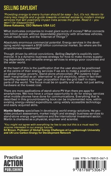 What motivates companies to invest giant sums of money? What connects two billion people without dependable electricity with driverless vehicles, virtual reality tech, and the 'Internet of Things'? Absolutely enormous commercial potential. Energy services in the developing world represent a $100 billion commercial market. So where are the proportionate investments? Though driven by ethical convictions, Selling Daylight is explicitly commercial. It is a dynamic business strategy for how to make money supplying dependable and versatile energy services to energy-poor countries and the wider world. At the heart of this is the justification that the user should be positioned at the centre of their energy services if we are to make a positive impact on global energy poverty. Stand-alone photovoltaic (PV) systems have been marginalized as an 'alternative' to grid electricity, when in fact their benefits represent a stronger proposition than the grid itself in many parts of the world. The focus must be on quality and value, not just selling hardware at the lowest cost. There are more applications of stand-alone PV than there are apps for smartphones. We now have a unique opportunity to do for energy services what mobile phones have done for communications. Everything that is described in this ground-breaking book can be implemented now, within existing energy-related expenditure, using widely accessible technology and easily acquired skills. Martin Bellamy specialises in developing world energy solutions. He provides product assessment, market insight and strategic business services to stand-alone energy organisations and the international investment sector. Martin is chartered as a physicist, engineer and scientist.