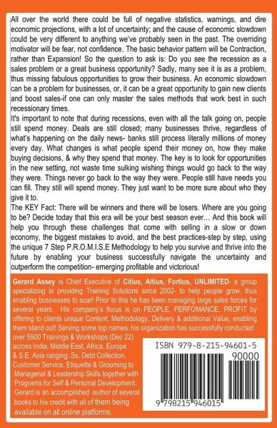 All over the world there could be full of negative statistics, warnings, and dire economic projections, with a lot of uncertainty; and the cause of economic slowdown could be very different to anything we've probably seen in the past. The overriding motivator will be fear, not confidence. The basic behavior pattern will be Contraction, rather than Expansion! So the question to ask is: Do you see the recession as a sales problem or a great business opportunity? Sadly, many see it is as a problem, thus missing fabulous opportunities to grow their businesses. An economic slowdown can be a problem for businesses, or, it can be a great opportunity to gain new clients and boost sales-if one can only master the sales methods that work best in such recessionary times. It's important to note that during recessions, even with all the talk going on, people still spend money. Deals are still closed; many businesses thrive, regardless of what's happening on the daily news- banks still process literally millions of money every day. What changes is what people spend their money on, how quickly they make buying decisions, & why they spend that money. The key is to look for opportunities in the new setting, not waste time sulking wishing things would go back to the way they were. Things never go back to the way they were. People still have needs you can fill. They still will spend money. They just want to be more sure about who they give it to. So this can be a great time to hone the team's skills and with the right strategies, and making adjustments, organizations can maintain or even increase business during a recession and, even when it is over, emerge bigger, with more growth potential, much loyal customers, larger earnings, and an organization that is solid, having now a track record to substantiate of having gone through the worst times- and emerging most successfully! The KEY Fact: There will be winners and there will be losers. Where are you going to be? Decide today that this era will be your best season ever… And this book 'SELLING IN A RECESSION' will help you through these challenges that come with selling in a slow or down economy- the biggest mistakes to avoid, and the best practices-step by step, using the unique 7 Step P.R.O.M.I.S.E Methodology to help you survive and thrive into the future by enabling your business successfully navigate the uncertainty and outperform the competition- emerging profitable and victorious!