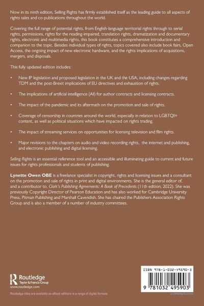 'Selling Rights (9th Edition) is an invaluable resource for anyone involved in publishing and rights management... Owen's clear and comprehensive approach makes this book an essential tool for understanding the complexities of rights transactions in today's global market. The 9th edition is undoubtedly an essential read for anyone looking to navigate the modern publishing landscape with confidence.'