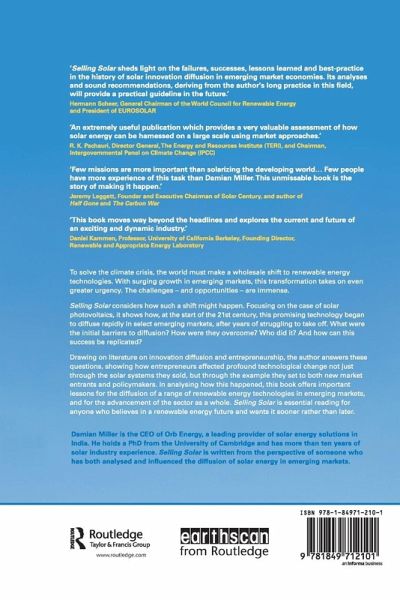 To solve the climate crisis, the world must make a wholesale shift to renewable energy technologies. With surging growth in emerging markets, this transformation takes on even greater urgency. The challenges - and opportunities - are immense. Selling Solar considers how such a shift might happen. Focusing on the case of solar photovoltaics, it shows how, at the start of the twenty-first century, this promising technology began to diffuse rapidly in select emerging markets, after years of struggling to take off. What were the initial barriers to diffusion? How were they overcome? Who did it? And how can this success be replicated? Drawing on literature on innovation diffusion and entrepreneurship, the author answers these questions, showing how entrepreneurs affected profound technological change not just through the solar systems they sold, but through the example they set to both new market entrants and policymakers. In analyzing how this happened, this book offers important lessons for the diffusion of a range of renewable energy technologies in emerging markets, and for the advancement of the sector as a whole. Selling Solar is essential reading for anyone who believes in a renewable energy future and wants it sooner rather than later.