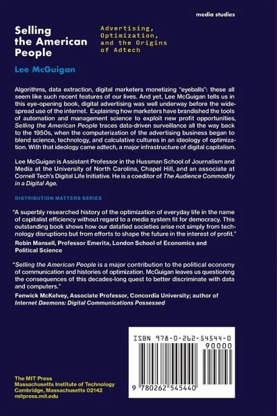 How marketers learned to dream of optimization and speak in the idiom of management science well before the widespread use of the Internet. Algorithms, data extraction, digital marketers monetizing "eyeballs": these all seem like such recent features of our lives. And yet, Lee McGuigan tells us in this eye-opening book, digital advertising was well underway before the widespread use of the Internet. Explaining how marketers have brandished the tools of automation and management science to exploit new profit opportunities, Selling the American People traces data-driven surveillance all the way back to the 1950s, when the computerization of the advertising business began to blend science, technology, and calculative cultures in an ideology of optimization. With that ideology came adtech, a major infrastructure of digital capitalism. To help make sense of today's attention merchants and choice architects, McGuigan explores a few key questions: How did technical experts working at the intersection of data processing and management sciences come to command the center of gravity in the advertising and media industries? How did their ambition to remake marketing through mathematical optimization shape and reflect developments in digital technology? In short, where did adtech come from, and how did data-driven marketing come to mediate the daily encounters of people, products, and public spheres? His answers show how the advertising industry's efforts to bend information technologies toward its dream of efficiency and rational management helped to make "surveillance capitalism" one of the defining experiences of public life.