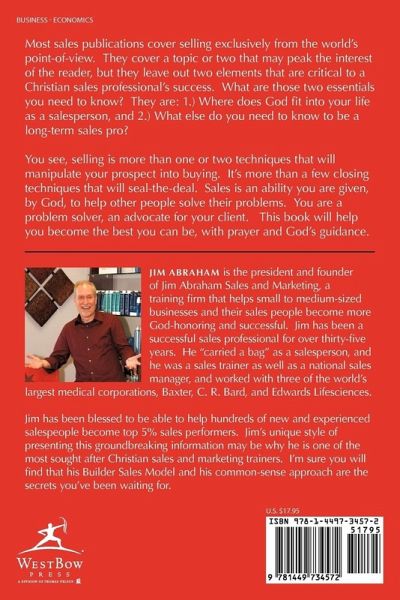 Most sales publications cover selling exclusively from the world's point-of-view. They cover a topic or two that may peak the interest of the reader, but they leave out two elements that are critical to a Christian sales professional's success. What are those two essentials you need to know? They are: 1.) Where does God fit into your life as a salesperson, and 2.) What else do you need to know to be a long-term sales pro? You see, selling is more than one or two techniques that will manipulate your prospect into buying. It's more than a few closing techniques that will seal-the-deal. Sales is an ability you are given, by God, to help other people solve their problems. You are a problem solver, an advocate for your client. This book will help you become the best you can be, with prayer and God's guidance.