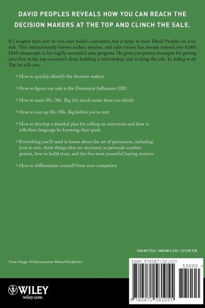 David Peoples reveals how you can reach the decision makers at the top and clinch the sale. It's tougher than ever to win over today's customers, but it helps to have David Peoples on your side. This internationally known author, speaker, and sales trainer has already trained over 8,000 IBM salespeople in his highly successful sales program. He gives you proven strategies for getting your foot in the top executive's door, building a relationship, and making the sale. In Selling to the Top, he tells you: * How to quickly identify the decision makers * How to figure out who is the Dominant Influencer (DI) * How to meet Mr./Ms. Big (it's much easier than you think) * How to size up Mr./Ms. Big before you've met * How to develop a detailed plan for calling on executives and how to talk their language by knowing their goals * Everything you'll need to know about the art of persuasion, including how to win, three things that are necessary to persuade another person, how to build trust, and the five most powerful buying motives * How to differentiate yourself from your competitor