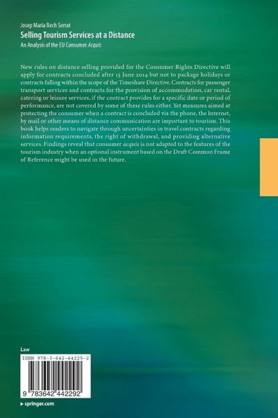 New rules on distance contracts provided for the Consumer Rights Directive of 25 October 2011 do not apply to package holidays or contracts falling within the scope of the Timeshare Directive. Moreover, contracts for passenger transport services and contracts for the provision of accommodation, car rental, catering or leisure services if the contract provides for a specific date or period of performance are not covered by some of these rules. Yet measures aimed at protecting the consumer when a contract is concluded via the phone, the Internet, by mail or other means of distance communication play a role in tourism. This book helps readers to navigate through uncertainties in travel contracts regarding information requirements, the right of withdrawal or providing alternative services. Findings reveal that consumer acquis is inadequately adapted to the features of the tourism industry when an optional instrument based on the Draft Common Frame of Reference might be used in the future.